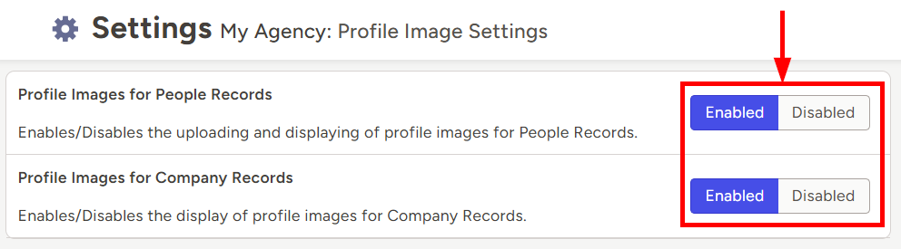 - From the Profile Image Settings page, use the toggles to Enable or Disable the collection and display of profile images for each record type