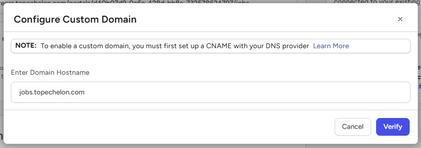 Once you've created a new CNAME record, you're ready to configure a custom domain for your TE Recruit Careers Page.