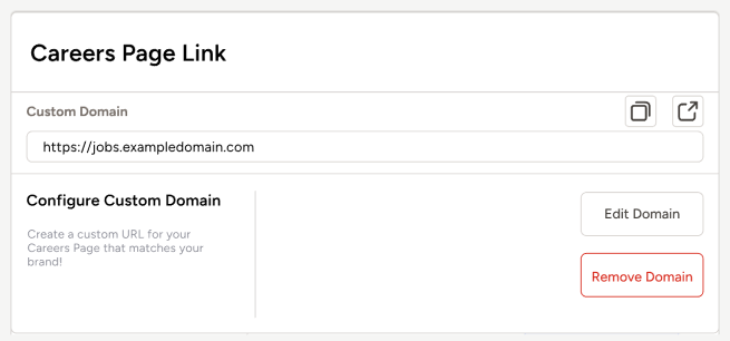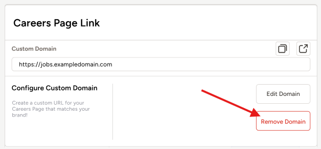Please be aware that removing this configuration will break any links that point to your Careers Page at the previously-configured subdomain. Make sure to update your website any time you make changes to this configuration, and be aware that existing links you might have sent or posted elsewhere online will become inaccessible.