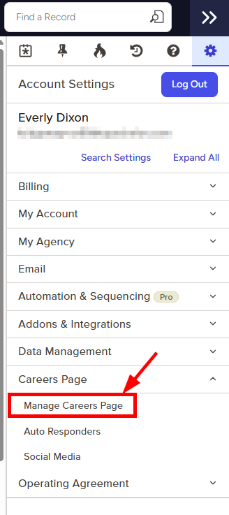- Click to expand the Careers Page section and then select Manage Careers Page