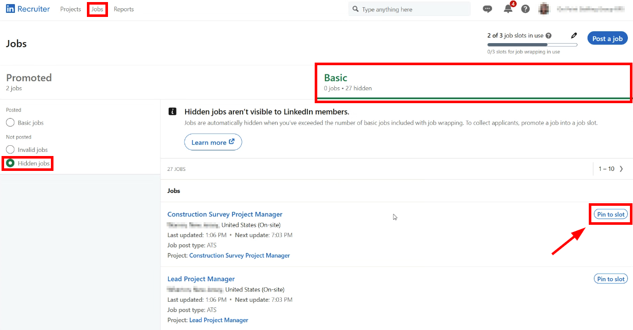 - If you are a third-party recruiter, your Jobs may be "hidden", but there is a Hidden jobs filter on the left side of the page. Click that filter to make the hidden jobs visible to you. Hidden Jobs will not be visible to job seekers unless/until they are pinned to a Job Slot, as described below.