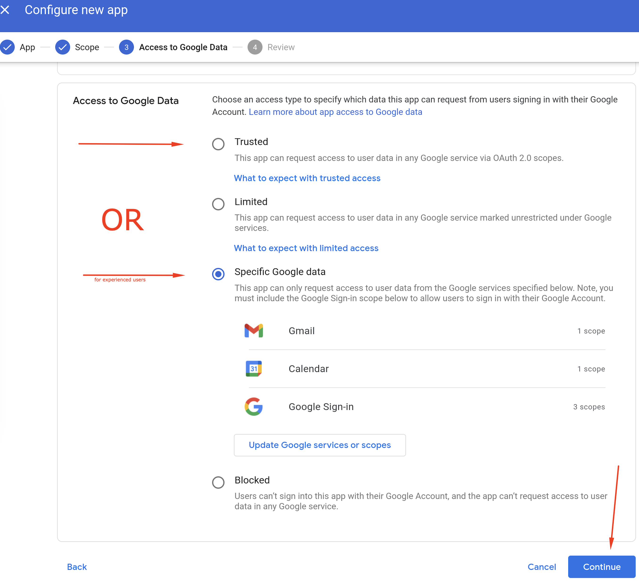 - On the final Configure new app page, select either Trusted or Specific Google data (to limit which Google services the app will have access to), and then click Continue to complete the process and save TE Recruit as a trusted app