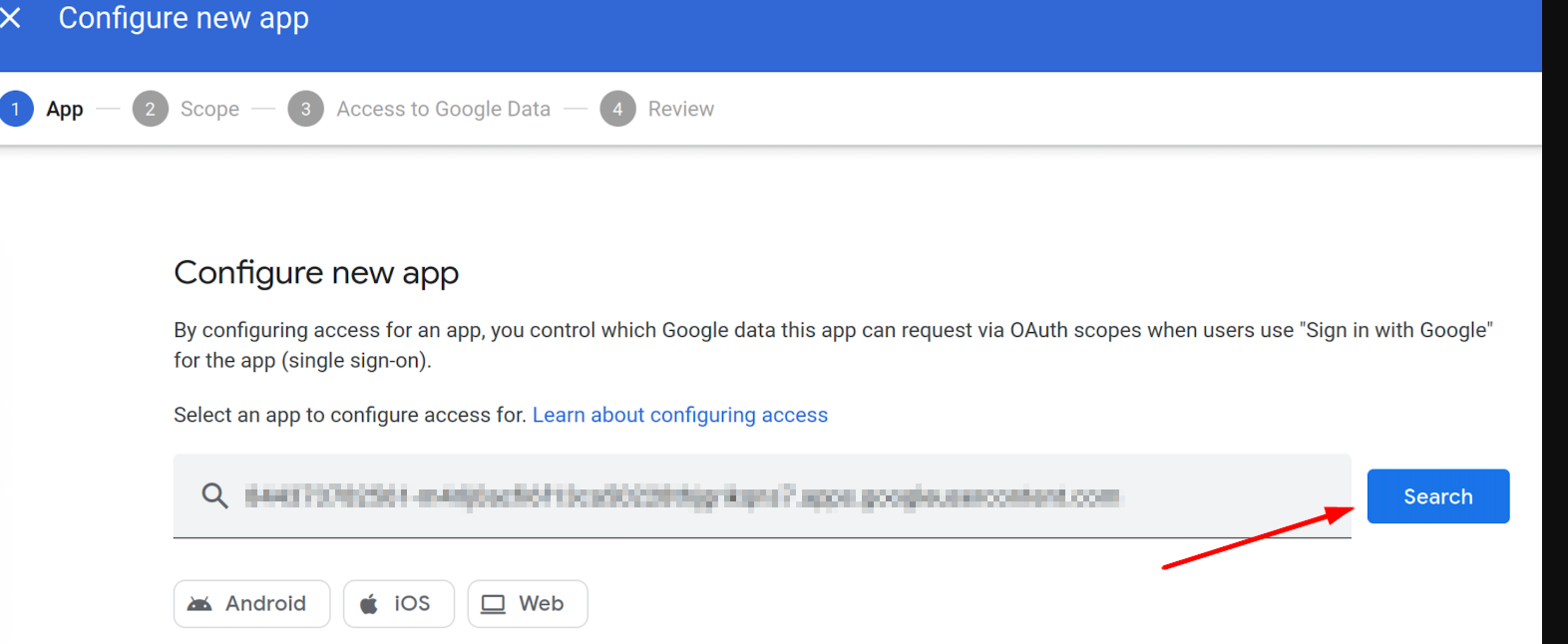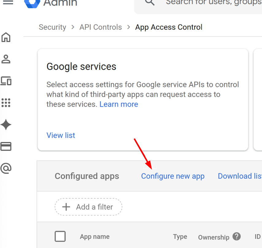 - On the App Access Control screen, click the Configure new app option near the middle of the page