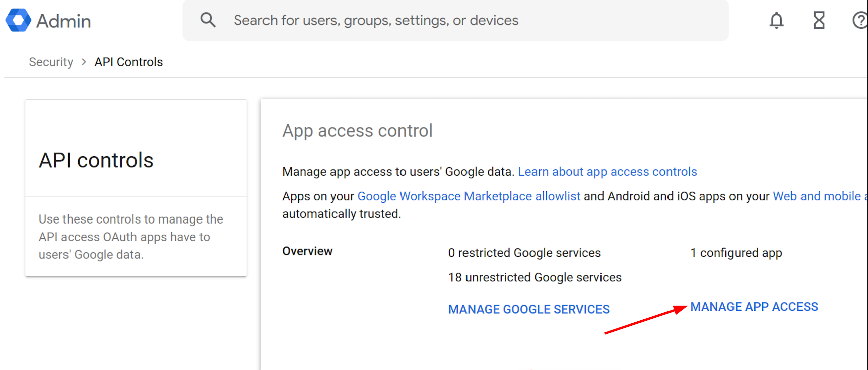 - From API controls, click MANAGE APP ACCESS