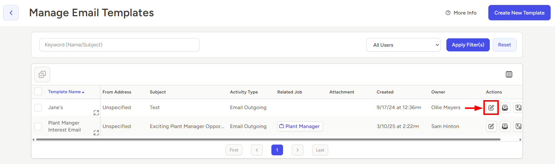 - Click the Edit Template action button in the corresponding row