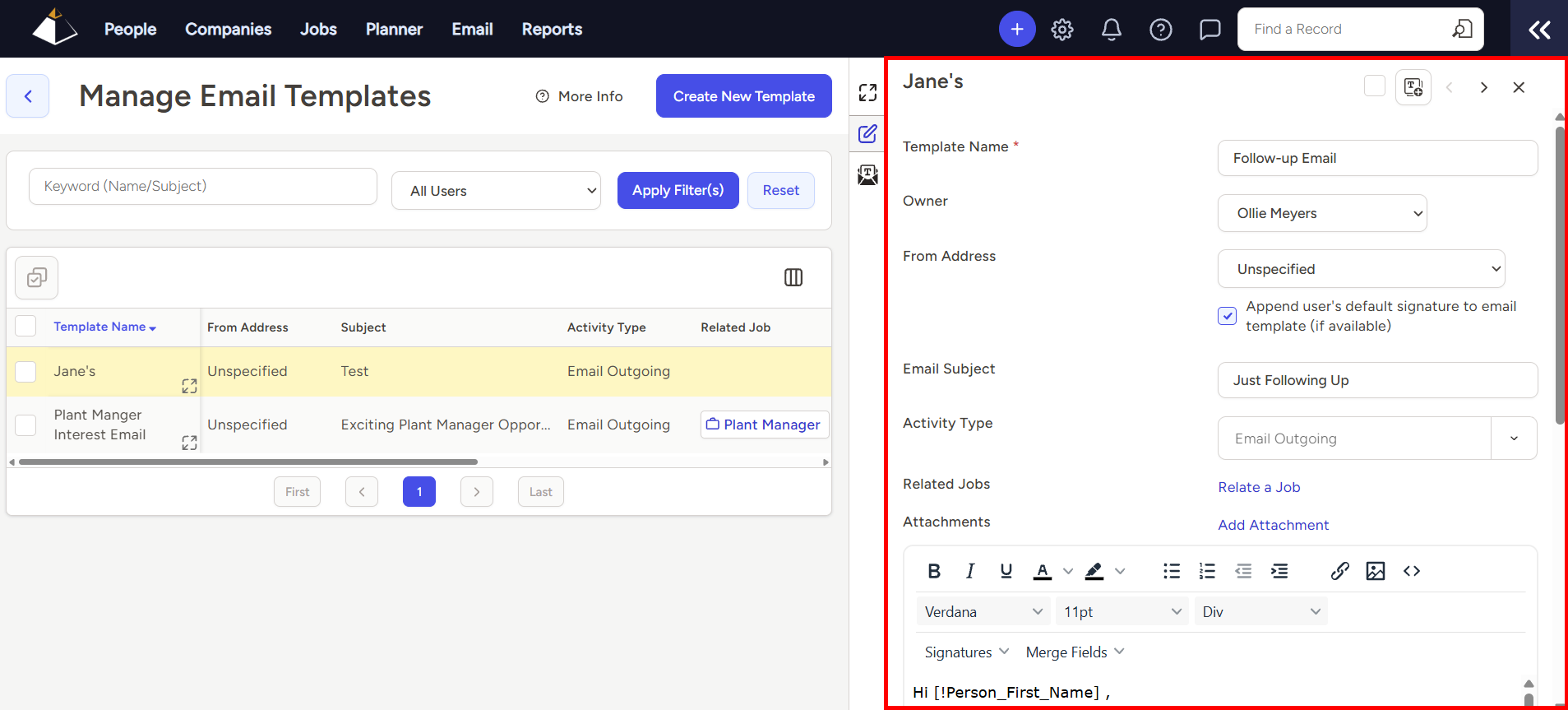 Email Templates can be created and customized in TE Recruit so you can quickly use them to send outgoing email messages whenever you need to. With the proper permissions, changes can be made to existing Email Templates at any time.