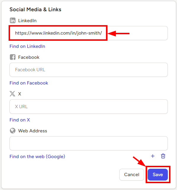- Paste (Ctrl+v for PC / Command+v for Mac) the profile URL into the corresponding text box and then click the Save button