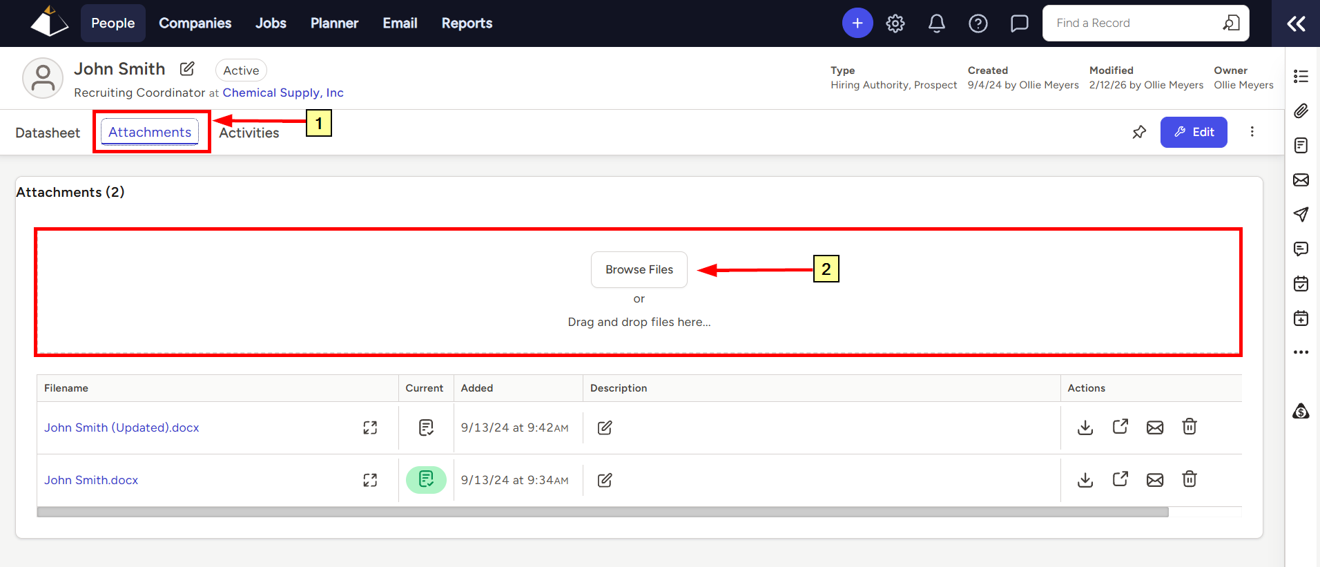 - Navigate to the corresponding Person’s Datasheet and click on the Attachments tab