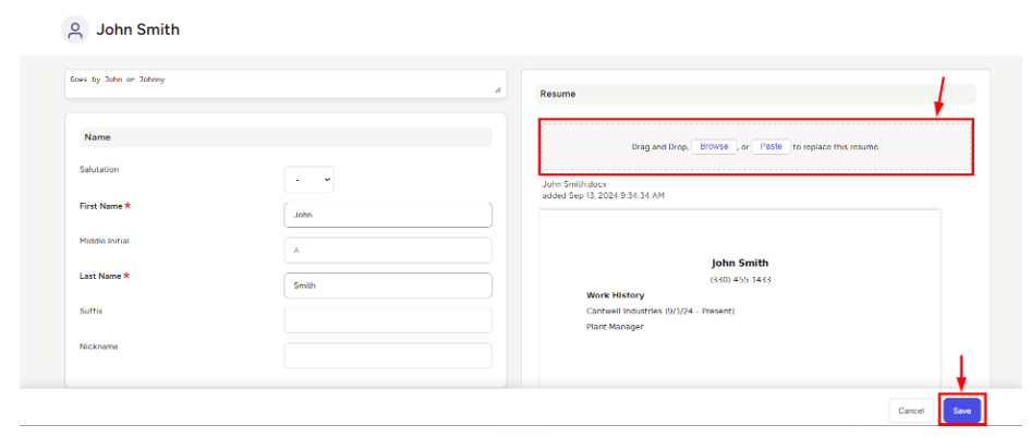 - You may opt for this option if little to no information needs updated on the record itself as re-parsing the resume may overwrite some existing fields (ex – name, address, etc).