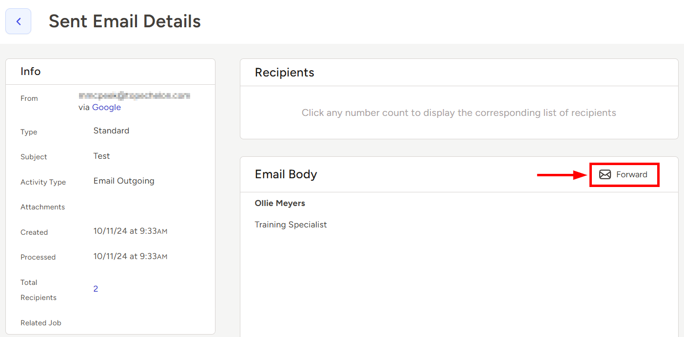 - From the Sent Email Details page, click on the Forward button in the top right corner of the Email Body card