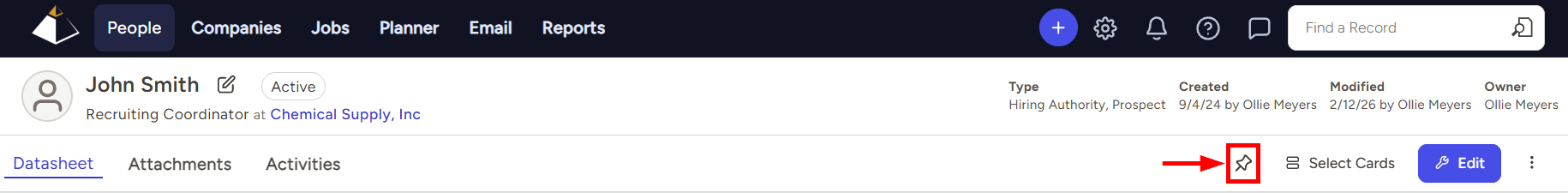 TE Recruit gives you the ability to pin records for quick and easy access in the future. Think of Pinning a record as marking it as a favorite or a bookmark.