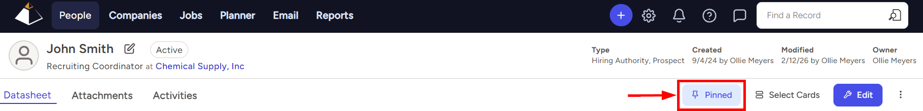 - Click on Pinned if you no longer want this record to be pinned