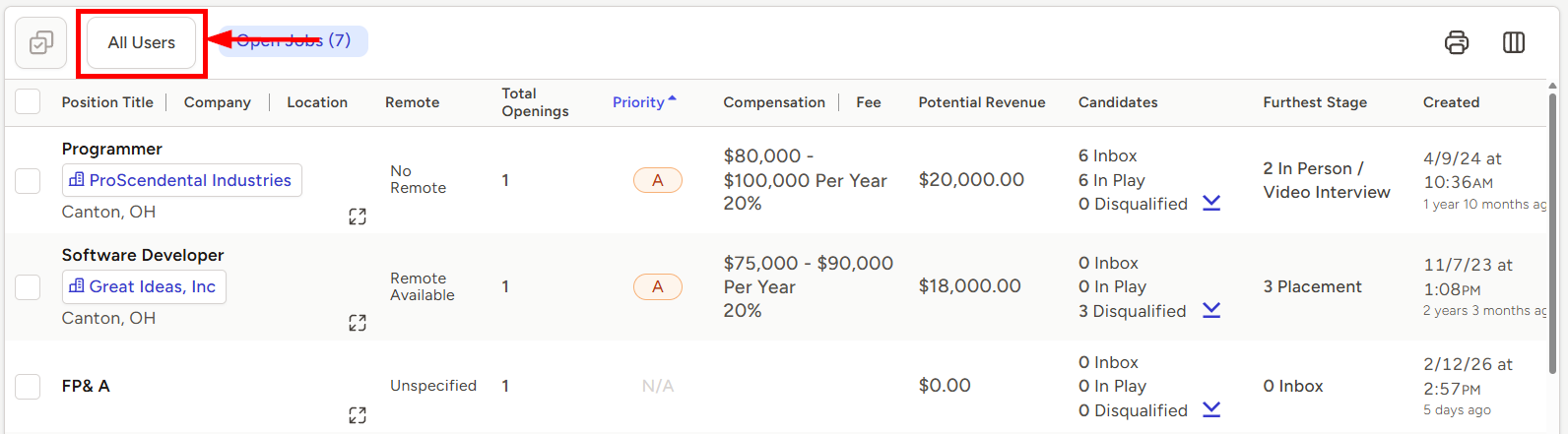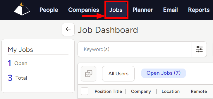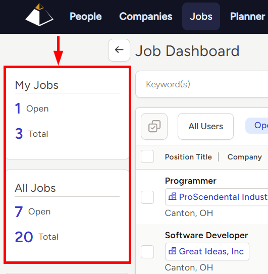 - In the middle of the Jobs Dashboard you’ll see a list of Open Jobs based on your selected user