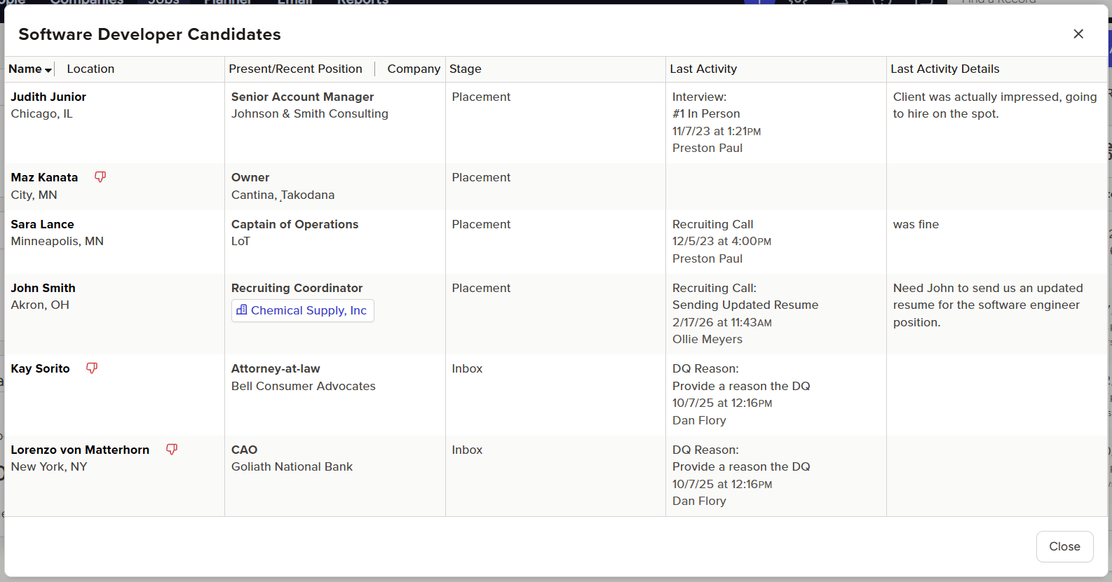 - Clicking in the Candidates column of a Job Order in either view will display a quick snapshot of the candidates associated with that Job’s Pipeline
