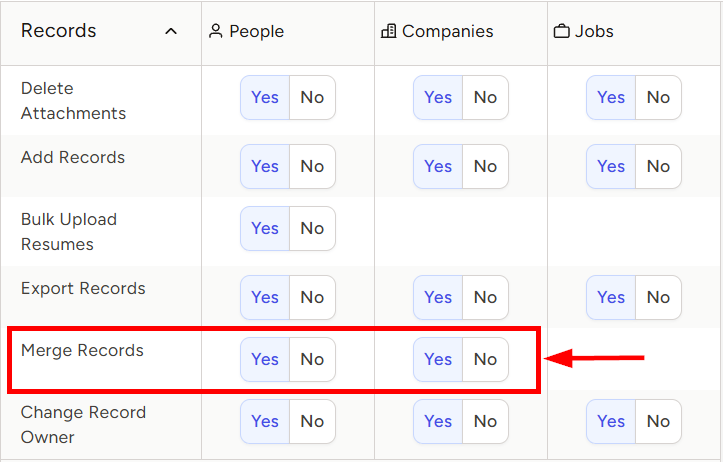 - Yes = this user can merge People and/or Company records