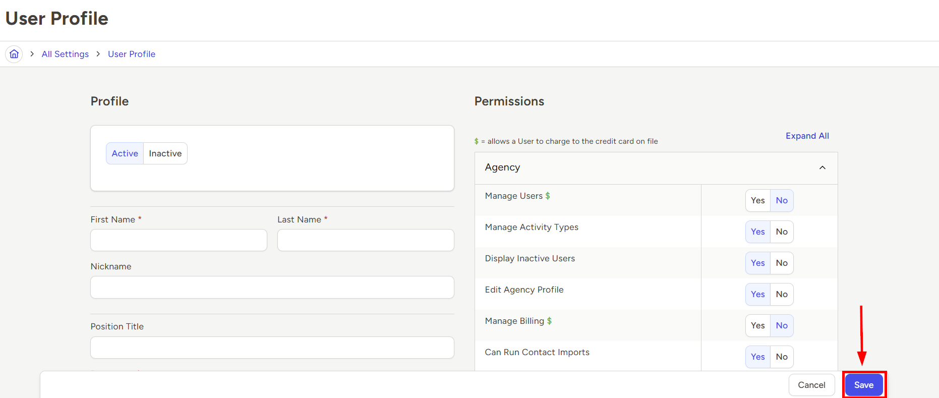 - Enter all appropriate information for the new user on the left side of the User Profile page