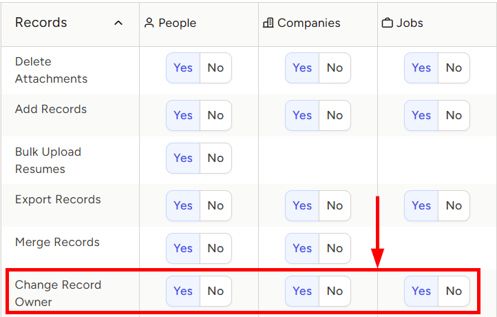 - Yes = this user can edit/change the owner field on any Person, Company, or Job Order record in TE Recruit