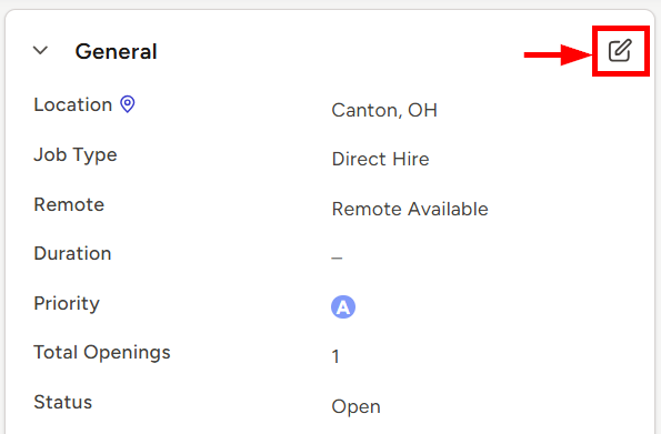 Priority can be assigned from the add screen of a new Job , as an inline edit to the General card on an existing Job’s Datasheet, or from the Open Jobs view of the Jobs Dashboard.