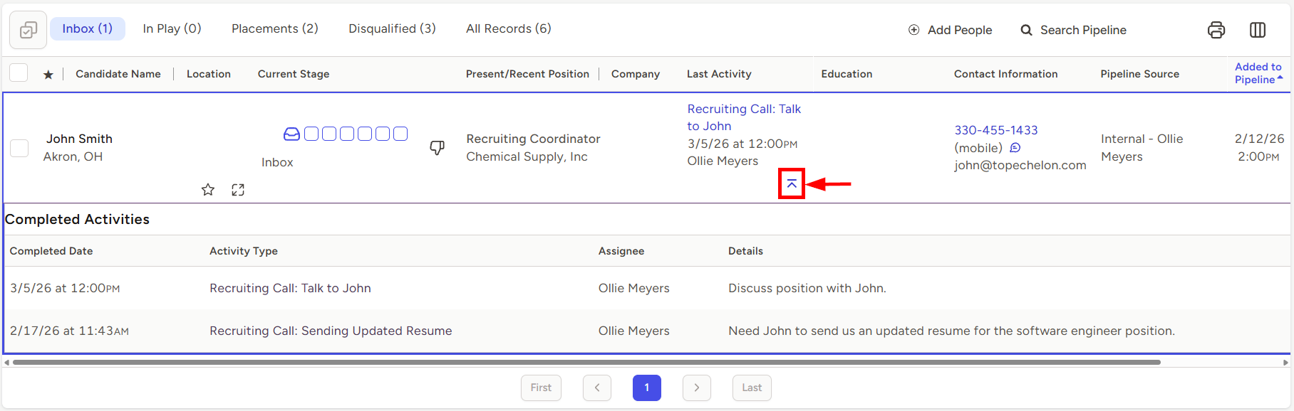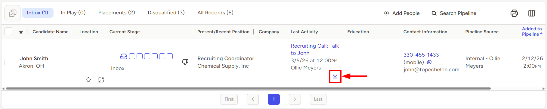 The Last Activity column in a Pipeline will always display the most recent Activity that was logged and linked to that Person and that Job record. To view a history of all activities associated with that Person and that Job, you’ll want to expand the activity history.