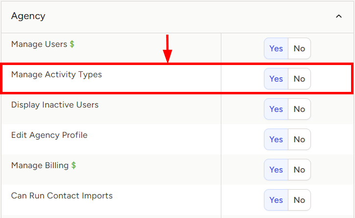 - To the right of Manage Activity Types, set the appropriate permission
