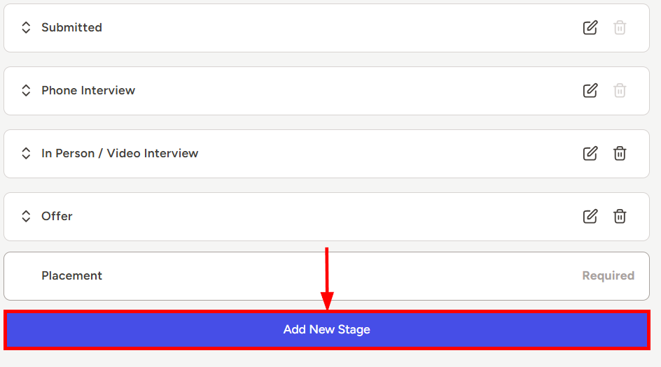 - Add/Edit/Delete Pipeline stages as needed and rearrange the list so that it matches your firm’s placement process