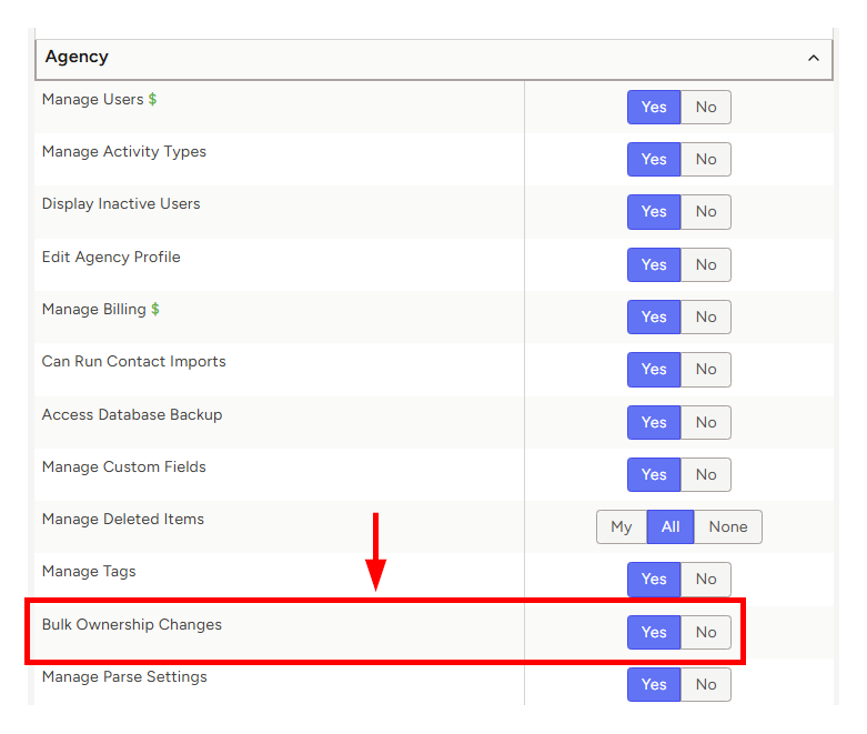 - To the right of Bulk Ownership Changes, set the appropriate permission