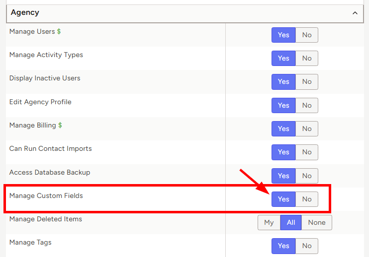 - Yes = this user can manage (add, edit, delete) custom fields