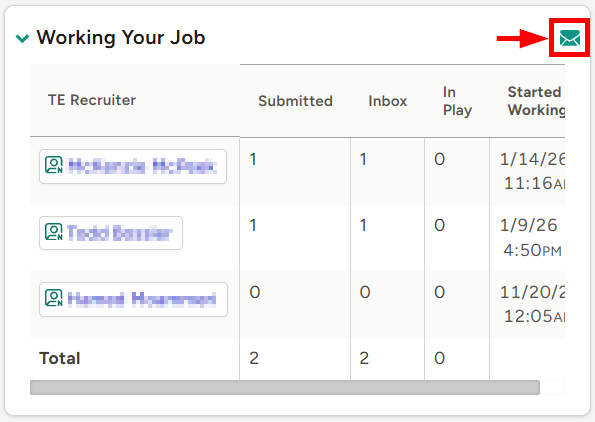This card will display the Recruiter info, counts of candidates they shared to this Job, along with the date they started working it.