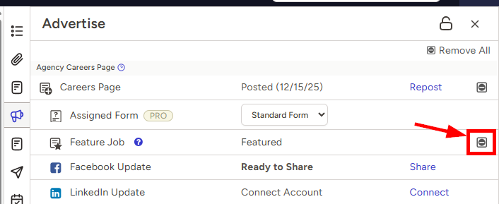 - Locate the Advertising card and click the Remove icon to the right of Feature Job in the Agency Careers Page section