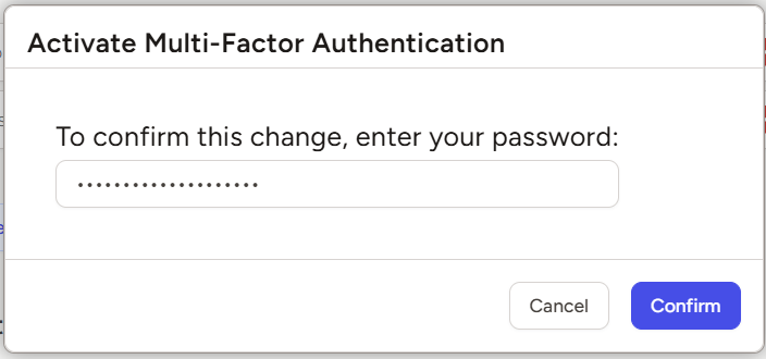 - Enter your current password to confirm that you wish to activate Multi-Factor Authentication for your account