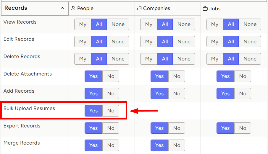 - Yes = this user can add People records to TE Recruit via the bulk resume upload feature