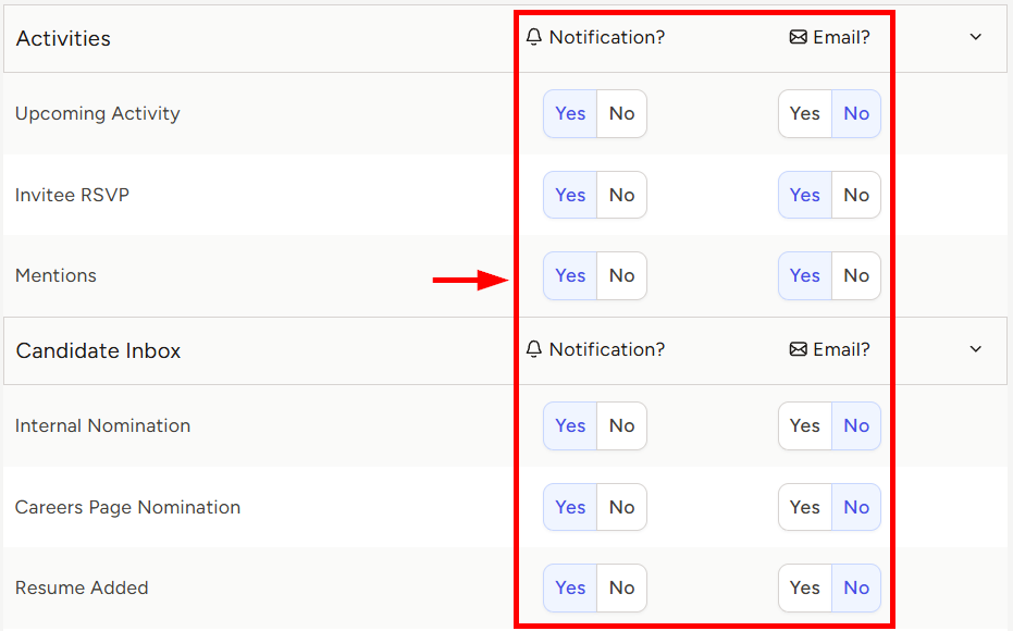 - To the right of each Notification type, use the toggles to designate which actions will trigger notifications and/or emails