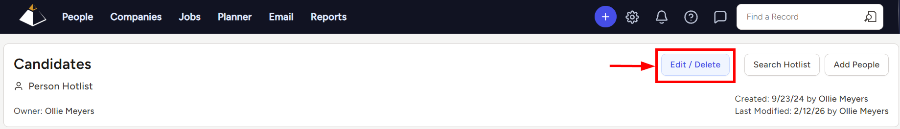 - Click the Delete Hotlist button at the top right of the edit page, to the right of the Hotlist title