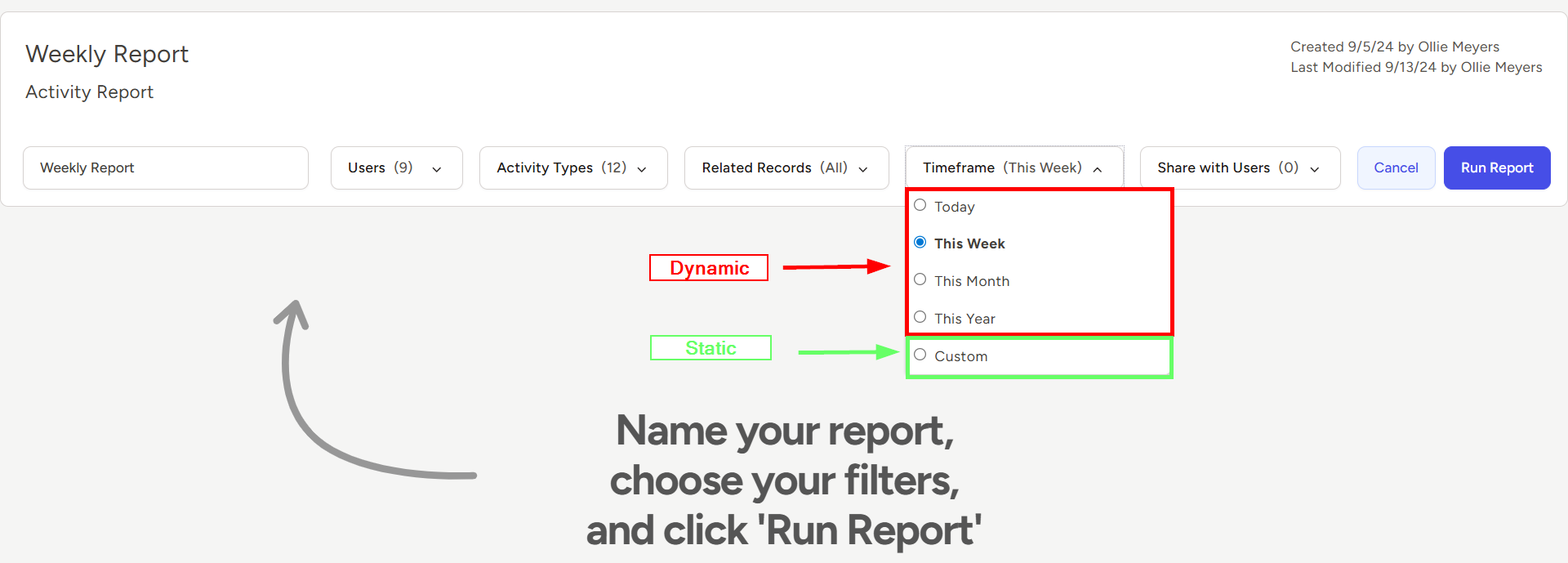 - Updating a report with a dynamic timeframe will always change the report date range to fit the appropriate selection.