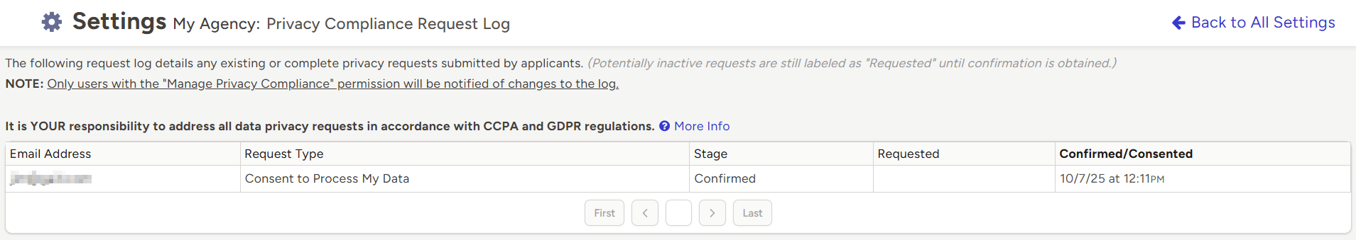 The Privacy Compliance Log keeps track of any incoming compliance requests from an agency’s Job Board/Careers Page that has their Data Privacy Compliance features activated.