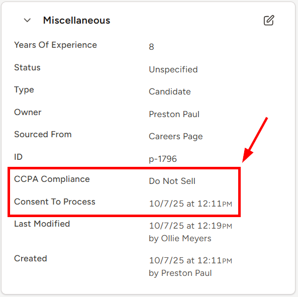 The Job Board/Careers Page application page’s options for Do Not Sell My Data and Consent to Process My Data are recorded to the Miscellaneous cards of their respective records in TE Recruit, as well as available for searching on the Advanced Search page: