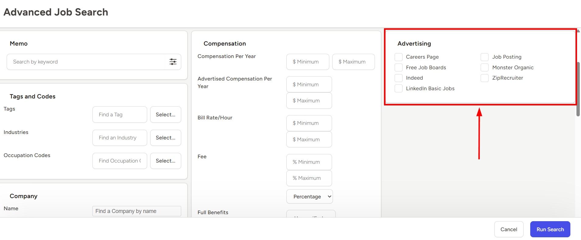 You can locate TE Recruit Jobs that are posted to specific advertising venues through an Advanced Search. This includes Jobs that your firm has posted to: