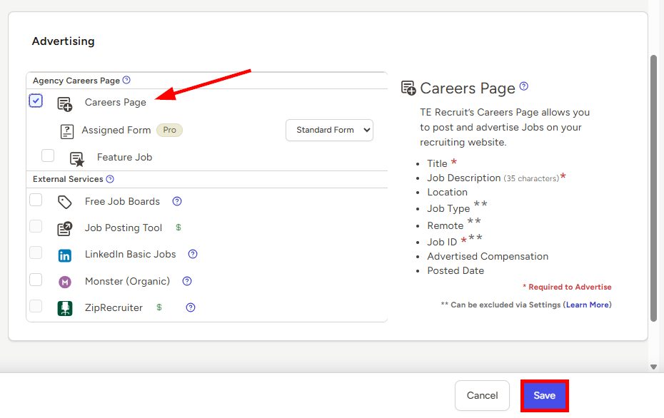 - Once all of your Job information is entered, look to the bottom right corner for the Advertising card and check the box to the left of Careers Page