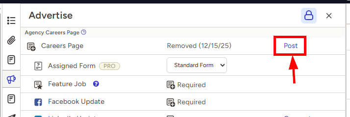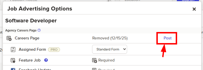 - Click the Post link to the right of the Careers Page option to advertise the job on your website