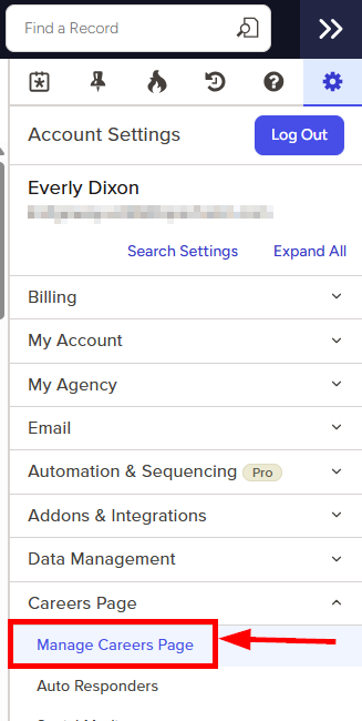 - Click to expand the Careers Page section and then select Manage Careers Page