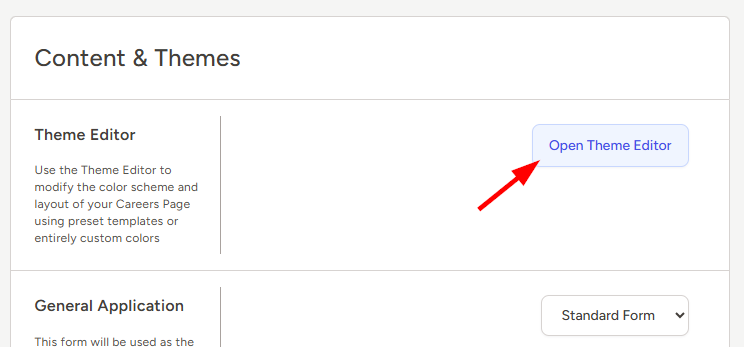 - From the Manage Careers Page settings page, locate the Content & Themes card and select the Open Theme Editor button