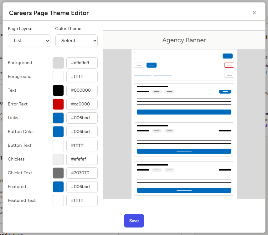 - Color Selectors: Use the color selection boxes to type in a hex code to customize the various aspects of your Careers Page, including the Background, Foreground, Text, Button Color, and more