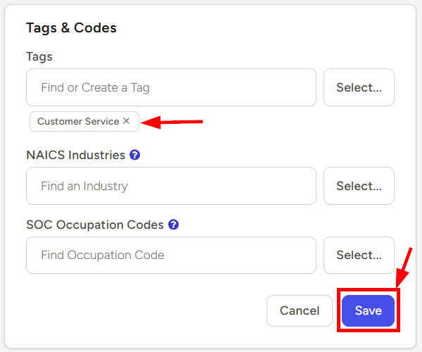 - Click the Save button once you’ve selected the appropriate Industries and/or Occupation Codes
