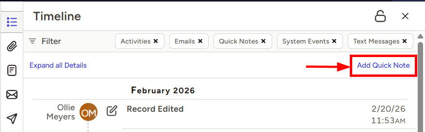 - Once saved, the Quick Note will be date, time, and user stamped and displayed in the Timeline of that record moving forward
