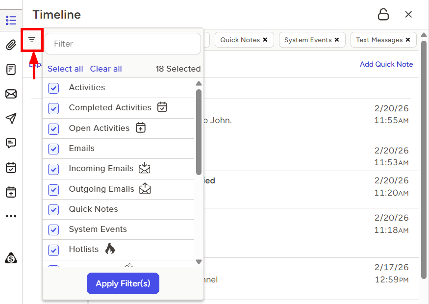 - You can also use the Filter button in the top left corner of the pane to customize what’s displayed in your Timeline