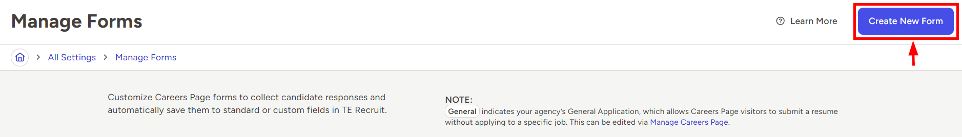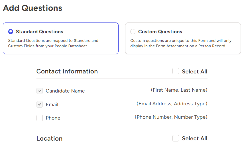Forms allow you to collect responses from candidates and save that information to fields on their records. Questions on a form can be saved to both standard and custom fields.