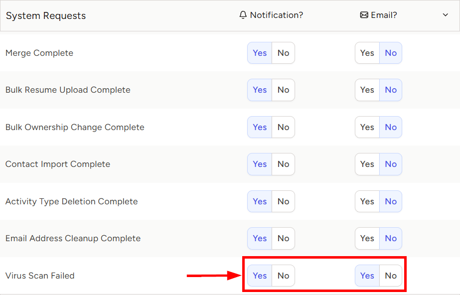 If an uploaded file is deemed unacceptable, a Notification will be sent to the user who uploaded this attachment. This file will not be added and any associated record will not be created. By default, you will receive a bell and email notification for each instance of an unacceptable file.