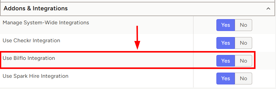 - Click to expand the Addons & Integrations section and then select Bilflo Integration