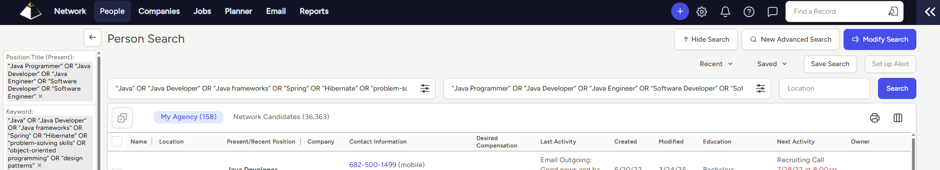 The Job Title search string will include the existing Job Title, and several common synonymous titles. The Keyword string will include the most important qualifications from the Job Description: items like experience, skills, education, and more.