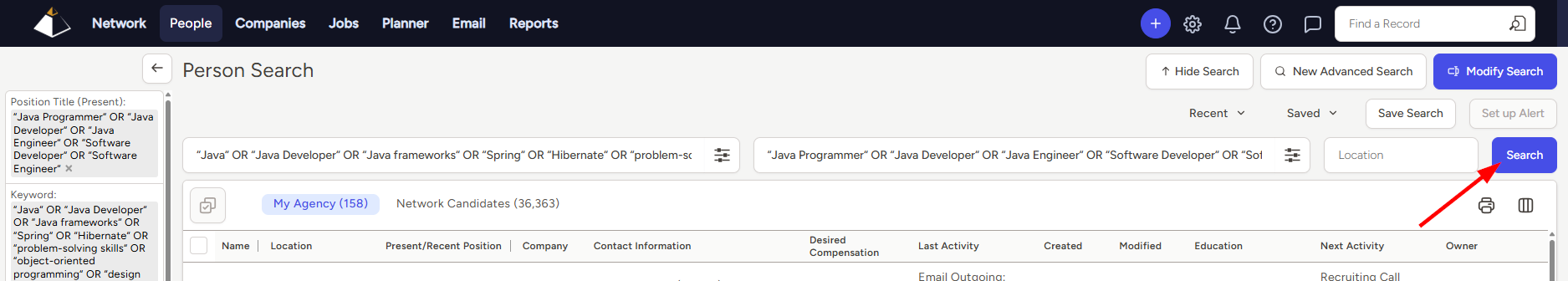 - When Smart-TE is done "thinking", you'll arrive at the People Advanced Search screen with the search criteria applied, and a list of matching candidates